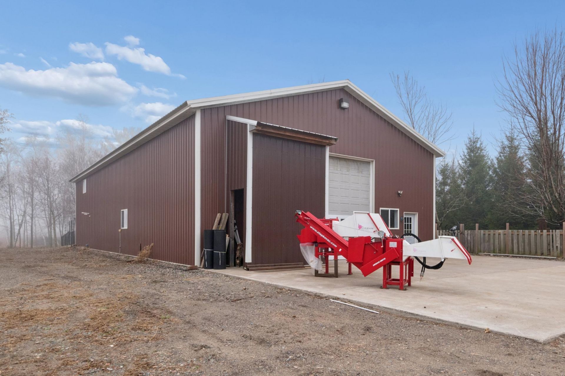 Your dream of owning a Barndominium can become a reality with this beautifully custom-built home. This generous 40x60 shop space with 16 ft tall ceilings has plenty of space for all of the cars and toys, plus there is a 2+ car detached garage space for additional storage. A large privacy fence surrounds the property, creating a peaceful retreat where you can fully enjoy the stunning landscaping and natural surroundings. The intricate paver patio features a serene koi pond, while a supercharged firepit anchors the fully fenced yard?perfect for relaxing or entertaining. Inside, the open-concept main level offers comfortable living with a wood-burning fireplace as a supplemental heat source that efficiently heats both the home and shop, keeping everything warm and inviting even on the coldest nights. The main heating is a 3-zone Warsbow high-efficiency in-floor system with a new heat exchanger that runs throughout the house and shop to keep your toes toasty warm. The spacious kitchen is thoughtfully designed with hickory cabinets, granite countertops, a gas stove, a Bosch refrigerator, and a walk-in pantry highlighted by a custom-painted door. All three bedrooms are on the upper level, with beautiful custom charred oak wood floors throughout. The primary bedroom includes the convenience of an in-closet laundry area. Additional features include two exterior hydrants for irrigation and livestock, an insulated chicken coop, and a 2+ stall garage?making this property as functional as it is unique.